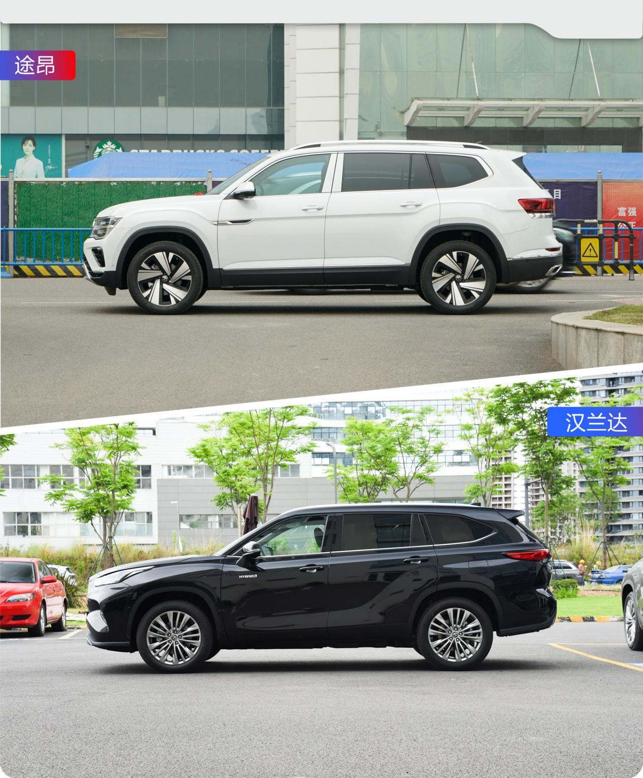 侧面造型途昂依然厚重强壮,相比来说汉兰达要显得更修长,实际尺寸方面,途昂要比汉兰达大一圈,它的长宽高和轴距都全面超越了汉兰达。