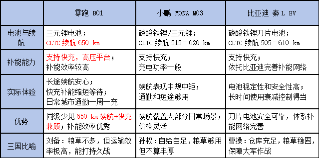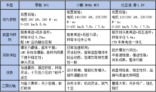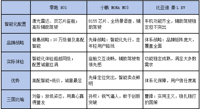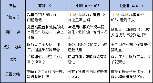 如果把他们放进“三国”的棋盘,角色几乎呼之欲出:零跑B01像刘备,白手起家,以“仁义”赢得民心;小鹏M03像孙权,江东小霸王,锐气逼人;秦L EV则像曹操,体系强盛,自带压迫感。