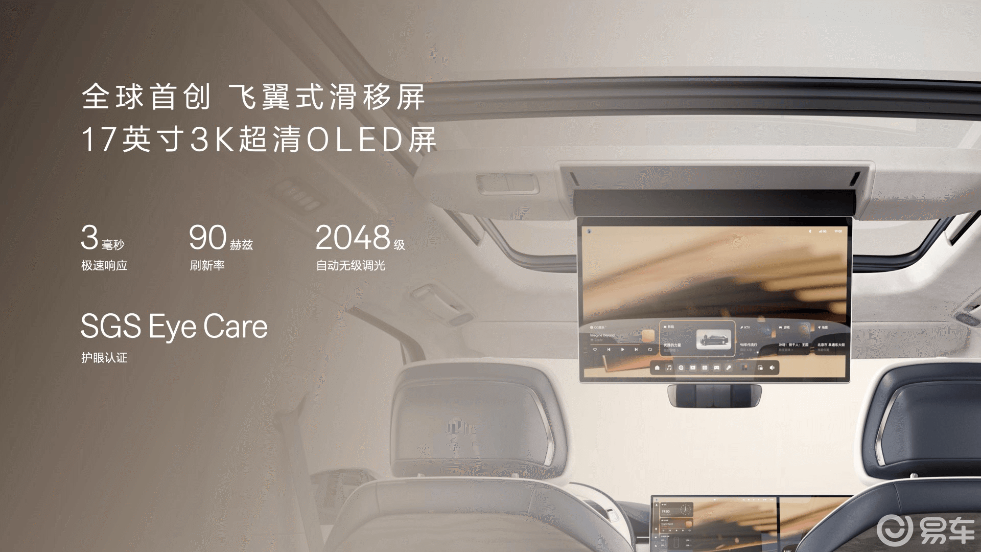 除了顶级音响,极氪9X还带来全球首创的飞翼式滑移屏。这块17英寸3K超清OLED屏由三星供应,可在二三排间电动无级滑移88厘米,并支持5档角度调节,让全车乘员都能舒适使用。其低蓝光的护眼认证,也确保全家观看无忧。
