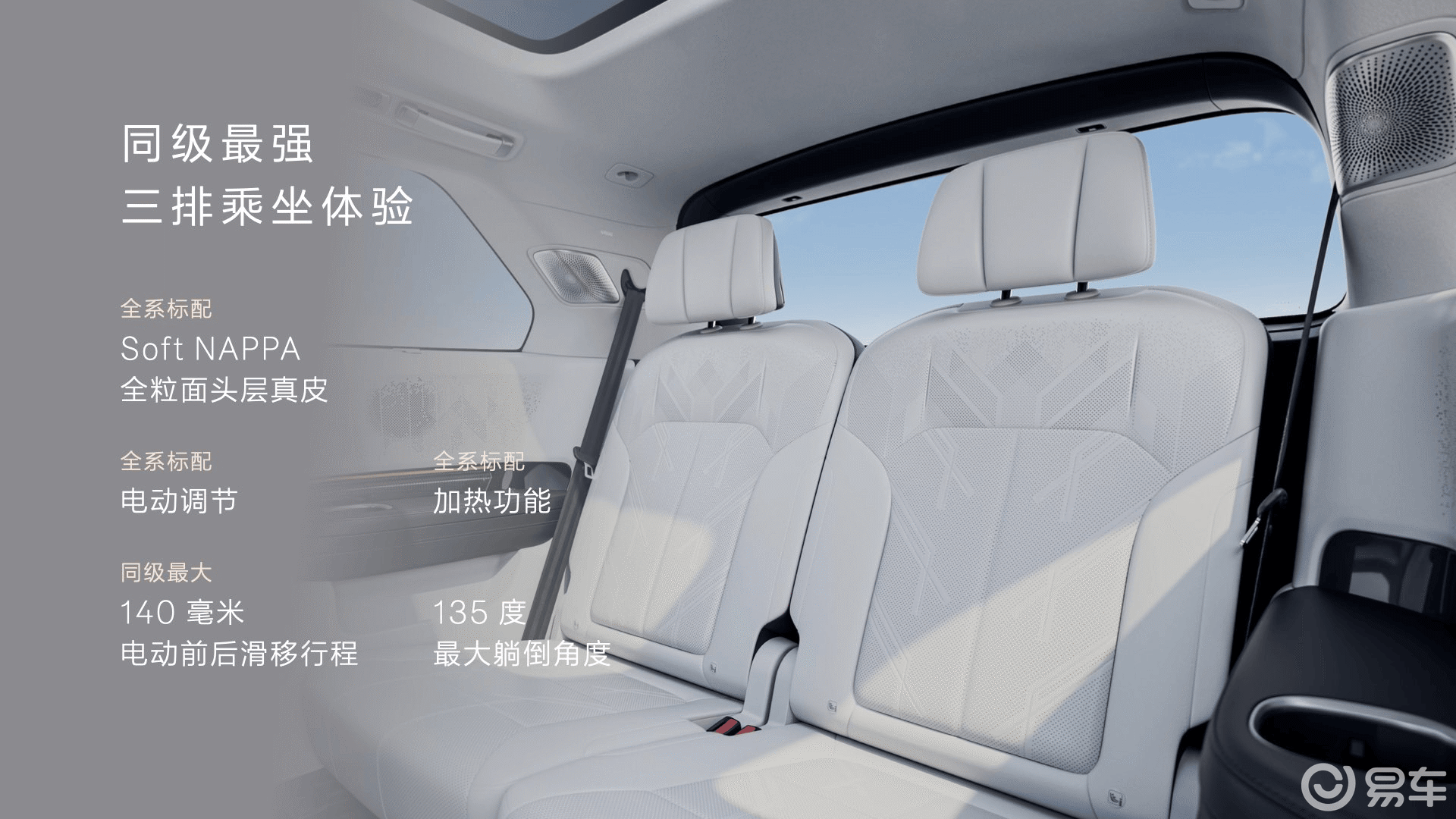 第三排同样不打折。极氪9X采用一体式压铸后端铝车身与强化CD柱结构来保护碰撞安全,能承受时速105公里的追尾与侧碰冲击。第三排还拥有同级最强的乘坐体验,最大135度躺倒角度与同级最大140毫米电动滑移行程,加上专属独立天窗与“坐坐高升”布局,让第三排成为通透明亮的阳光房。