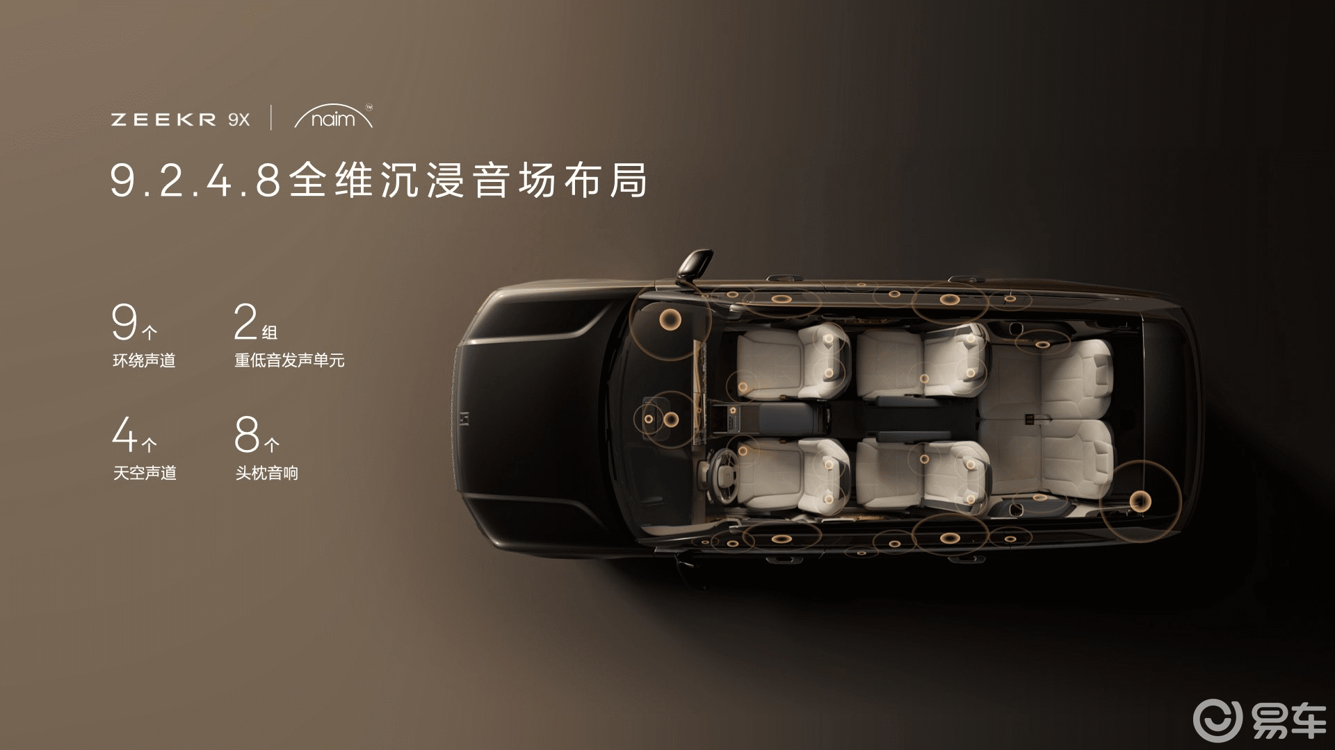 在极致的静谧表现之上,极氪与英国皇室御用音响品牌Naim深度合作,为极氪9X联手打造全球最大功率的车载音响。它拥有3868瓦的峰值功率,32个扬声器,支持杜比全景声,采用9个环绕声道、4个天空声道、8个头枕音响及2个低音炮,让每个座位都能享受殿堂级沉浸音效。