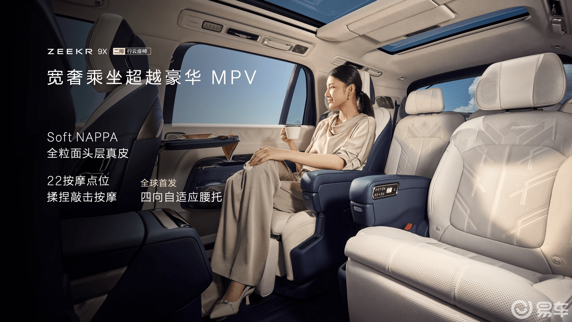 第二排则化身“私人会客厅”。极氪9X的二排配备两把SUV中最舒适的独立行云座椅,拥有超越豪华MPV的宽大坐垫、009同款梦幻回弹海绵,以及行业首发智能腰托和22点位按摩理疗功能。行云座椅可一键进入零重力座椅模式,腰部和腿部角度参考NASA标准,开发阶段邀请300多位潜在用户实测优化,带来更大145度躺角和23度的坐垫上翘角度。行云座椅还可切换伊姆斯躺椅模式,配合全系标配的同级最大9升智能冷暖恒温冰箱,无论商务洽谈还是旅途休闲,都能享受顶级舒适与尊崇。更具匠心的是,二排座椅可旋转180度与三排形成对坐模式,变成一个面对面的私人空间。