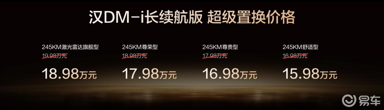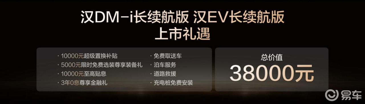 此次,汉DM-i长续航版共推出4款车型,补贴后售价15.98万~18.98万;汉EV长续航版共推出3款车型,补贴后售价17.38万~20.58万(10月31日前完成购车可享1万元超级置换补贴)。同时,比亚迪还为用户准备了包含置换补贴在内的至高价值3.8万元七大礼遇。