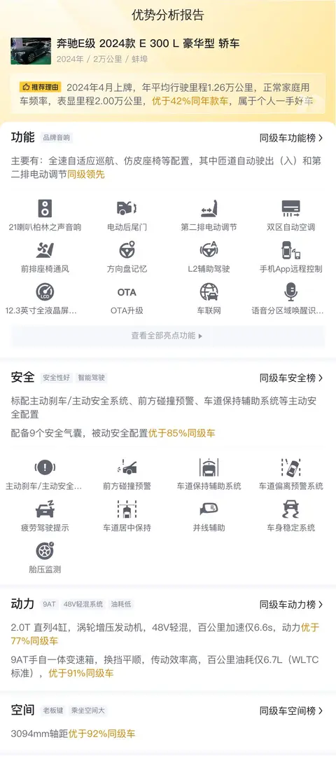 这款奔驰E级2024款E300L豪华型轿车在配置方面也是下足了功夫。全速自适应巡航、仿皮座椅、手机无线充电、疲劳驾驶提示……每一项都实实在在地为驾驶者和乘客带来了更加舒适、便捷和安全的驾乘体验。特别是那全方位的座椅调节和按摩功能,简直就像是把头等舱的座椅搬进了车内,让你在忙碌的生活中也能找到那份属于自己的小确幸。还有那手机无线充电功能,让你告别繁琐的线缆,轻松享受科技带来的便捷。而在安全性方面,这款车更是毫不含糊。标配的主动刹车/主动安全系统、前方碰撞预警、车道保持辅助系统等主动安全配置,仿佛时刻有守护天使在你身边,为你保驾护航。那些潜在的道路风险?交给它来处理吧!你只需安心驾驶,享受驾驶的乐趣。至于那些小恩小惠般的细节设计,更是让这款车在实用性与舒适性之间找到了完美的平衡点。无论是车内储物空间的精心规划,还是座椅材质的选择与搭配,每一个细节都透露着奔驰对于品质的追求和对用户的关怀。而作为一款豪华型轿车,这款车在市场上的表现也是相当抢眼。虽然目前尚未有过户记录,但其保值率已经达到了惊人的70.8%!这意味着即使是在二手车市场上,它依然能够保持较高的价值。对于那些想要购买二手车的消费者来说,这无疑是一个不容错过的选择。