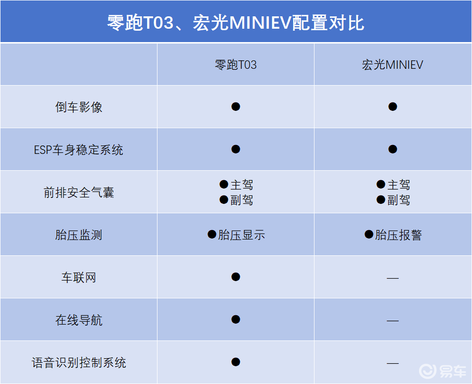 聊完了内饰,紧接着咱们来看看两台车的内部配置,基础配置部分,两台车都配备了倒车影像,加上两台车的尺寸都比较小巧,日常泊车还是很方便的,即便是新手司机,也可以轻松驾驭。同时,两台车都配备了ESP车身稳定系统、主副驾气囊,基础的安全性也有保证。不过,两台车虽然都配备了胎压监测系统,但零跑T03采用的是主动式的胎压显示,可以显示每个轮胎的具体胎压数据,如果轮胎失压,显示会更直观,宏光MINIEV则是胎压报警,只有轮胎失压时,会有提醒,但没办法从仪表上看出是哪个轮胎失压,这个细节,零跑T03会做得更好。
