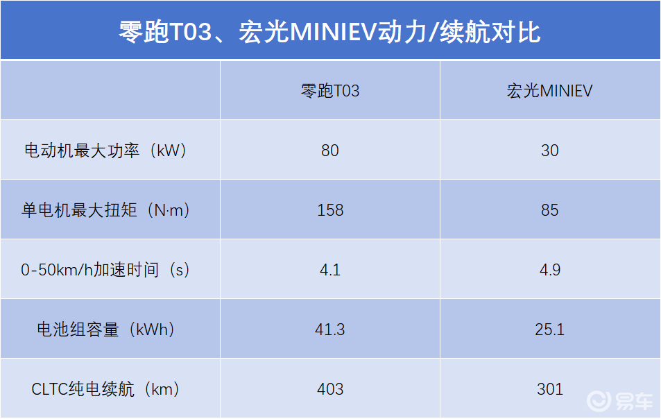 对于纯电动车而言,动力和续航还是咱们该关注的部分,毕竟这也关系到咱们的出行半径和驾驶感受。动力部分,零跑T03的电动机最大功率达到80kW,宏光MINIEV是30kW,二者拉开了明显差距。作为电动车,二者的初段动力比较接近,但越往后走,零跑T03的后劲会更足,比如咱们从60km/h提速到100km/h,零跑T03的动态加速就会更快,在实际的用车场景中,大家就可以想象,咱们超车时,零跑T03会来的更快,尤其是国道超车,会更轻松。