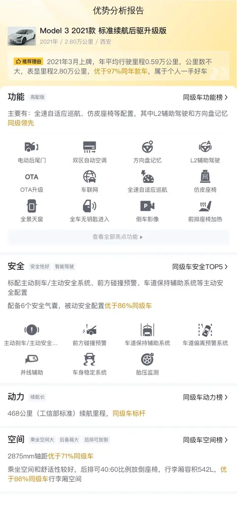在竞争激烈的电动汽车市场中,每款车型都展现出独特的魅力与实力。与同级别竞品相比,这款二手Model 3在多个方面展现了其出色之处。无论是在续航能力、充电效率还是动力表现上,它都展现出了不俗的竞争力。当然,每个品牌都有其特色和技术优势,选择哪款车型还需根据个人需求和偏好来决定。但可以肯定的是,这款二手Model 3凭借其卓越的性能、合理的用车成本和良好的市场口碑,在众多选择中是一个值得认真考虑的对象。