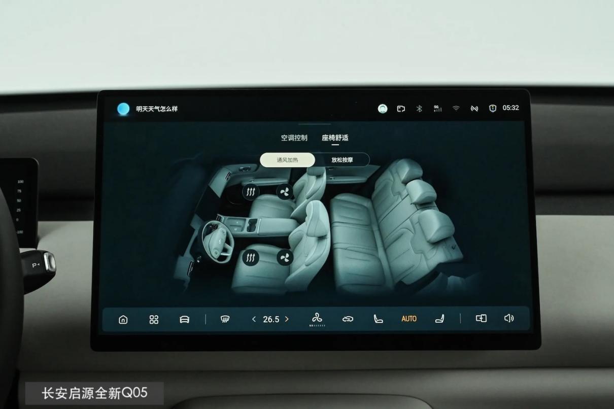 长安启源全新Q05的天枢座舱标配了10.17+15.6英寸双屏,通过算力为20TOPS的MT8676芯片支持,还有更高的24GB运行内存,虽说缺少二排语音支持,但甭管是智能场景推荐、拟人对话,还是说对HiCar/Carlink/CarPlay/荣耀互联的支持,除了上手更容易外,交互起来也更有趣。加上它用手机就能提前开启座椅加热,冬天出门也更舒适些。