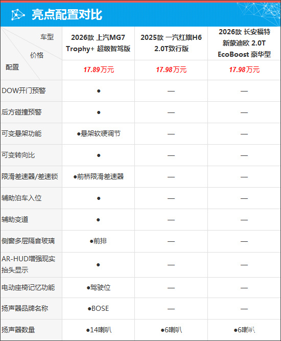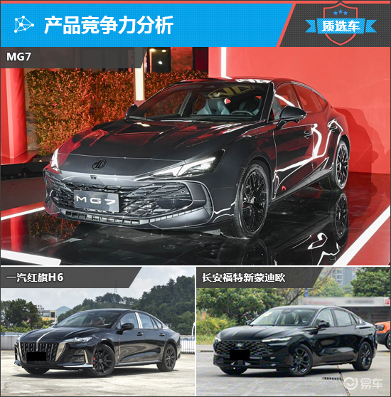 价格方面,MG7的起售价最低,而顶配车型价格最贵的是红旗H6。车型数量上,红旗H6和蒙迪欧均达到了6款,MG7为4款。